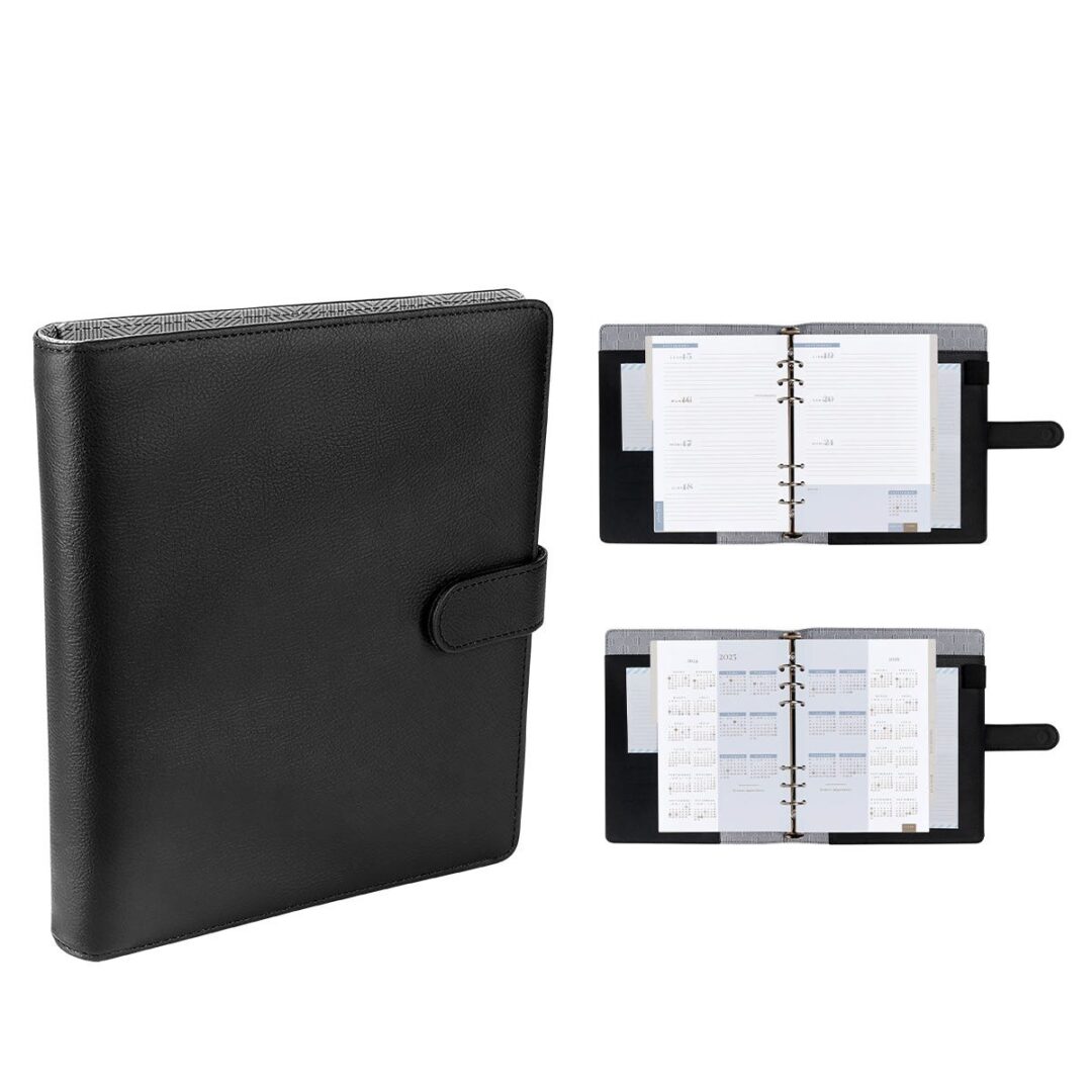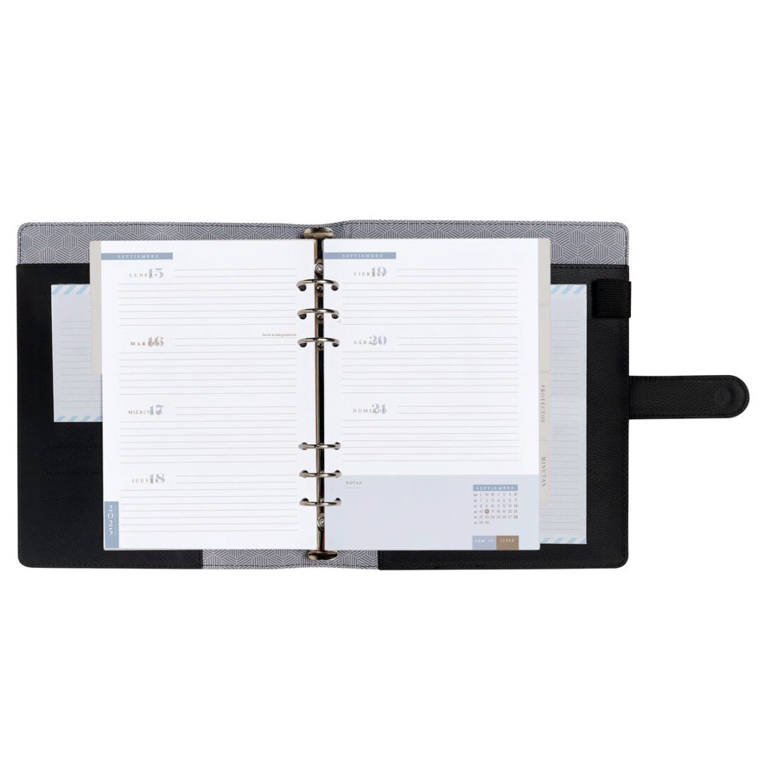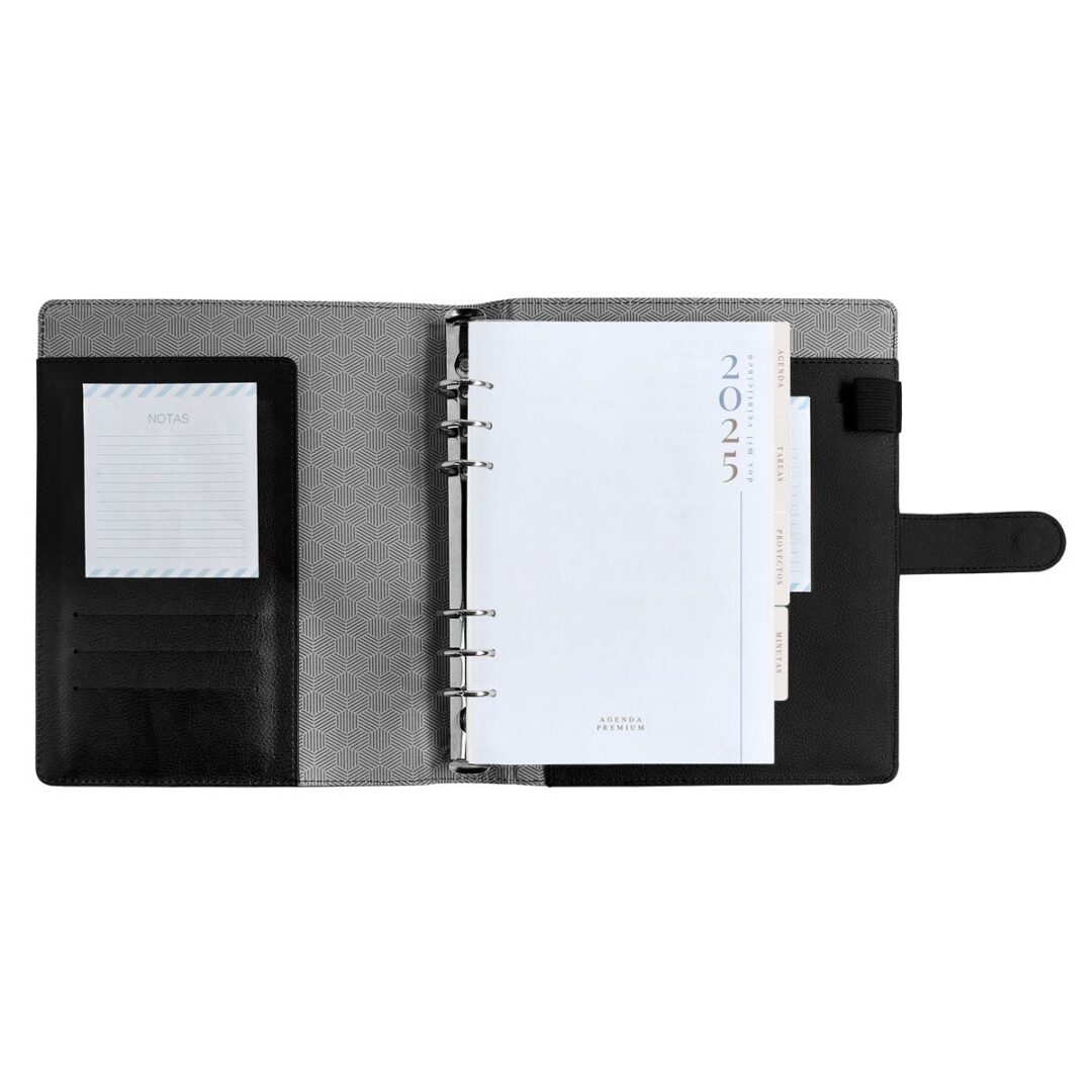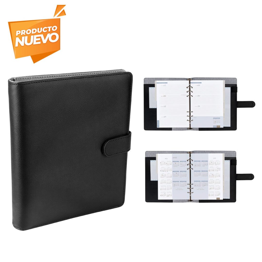 Agenda semanal con 145 hojas. Contiene datos personales, calendarios 2024-2025-2026, planeador 2025, presupuesto de gastos, seguimiento de nuevos hábitos, organizador de tareas, planeador de proyecto y días festivos. Incluye 7 secciones con separador de cartón, regla flexible, porta documentos, block de notas de 9.5 x 9.5 cm, block de notas de 14 x 18 cm, 3 hojas de notas adhesivas y caja individual tipo regalo.