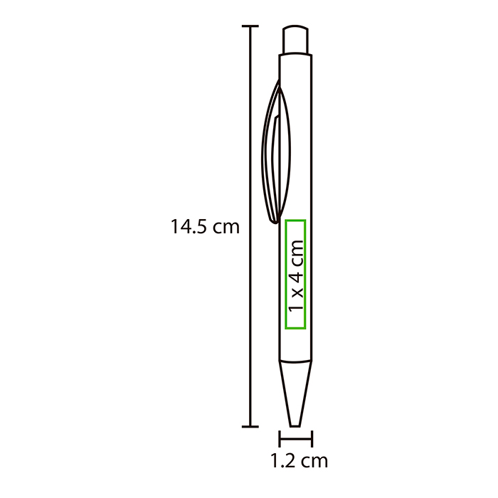 Bolígrafo de plástico retráctil y tinta negra. Medidas: 14.5×1.2 cm. Area de impresión: 4×1 cm. Material: PLÁSTICO
