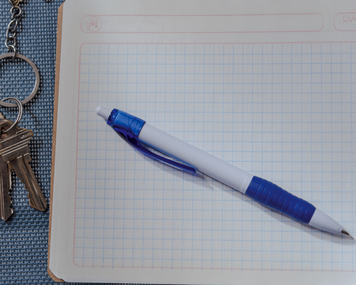 Bolígrafo de tinta de gel cuerpo blanco y clip. Con goma texturizada antideslizante del color del clip. Mecanismo de click.