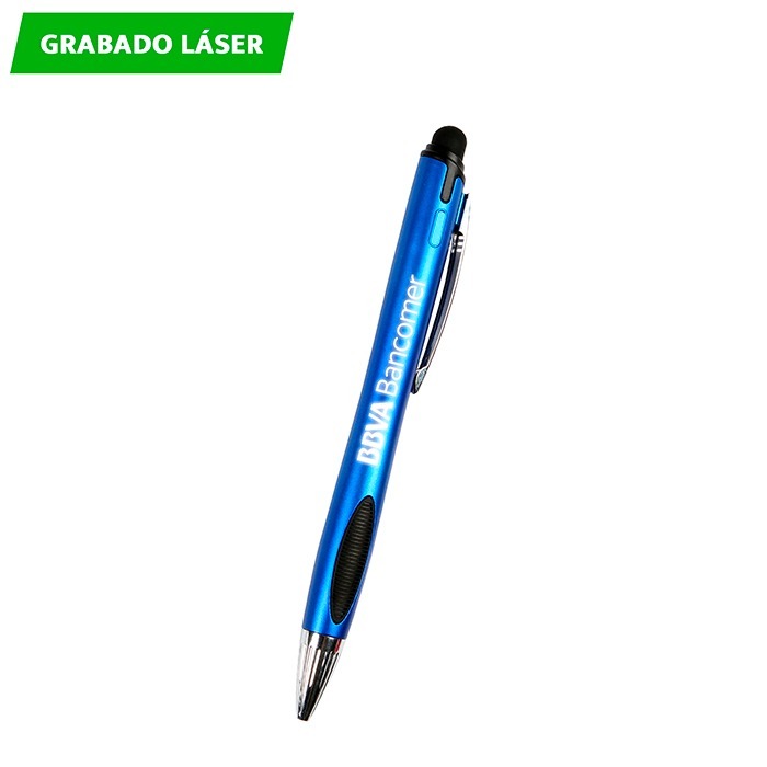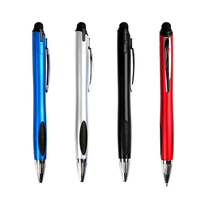 Bolígrafo de plástico con luz en interior para resaltar logotipo, detalles cromados puntero touch y grip negro. Tinta de escritura negra.