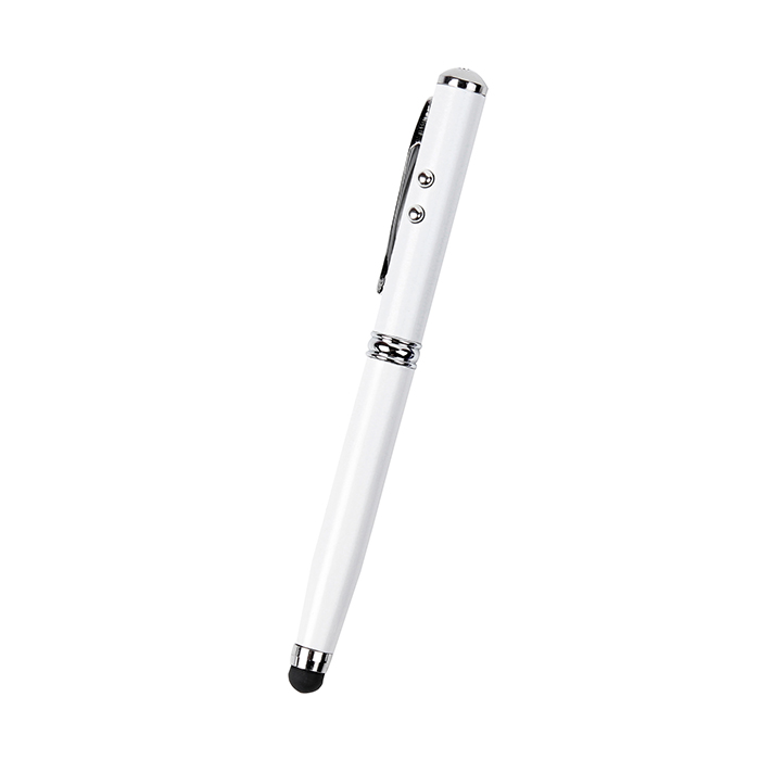Bolígrafo metálico con lámpara, señalador láser, puntero touch y detalles cromados. Incluye estuche de plástico con base para fijar bolígrafo, tapa trasparente con imán para cerrar. Tinta de escritura negra.