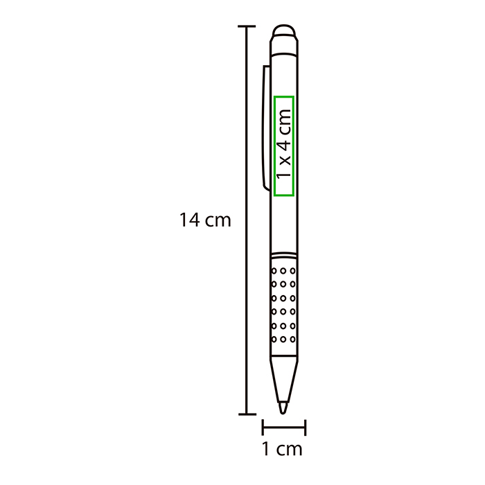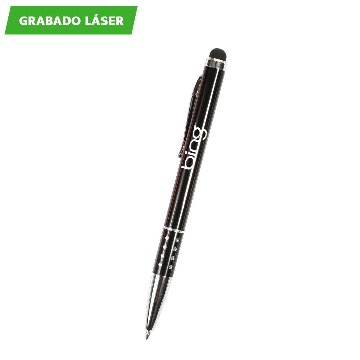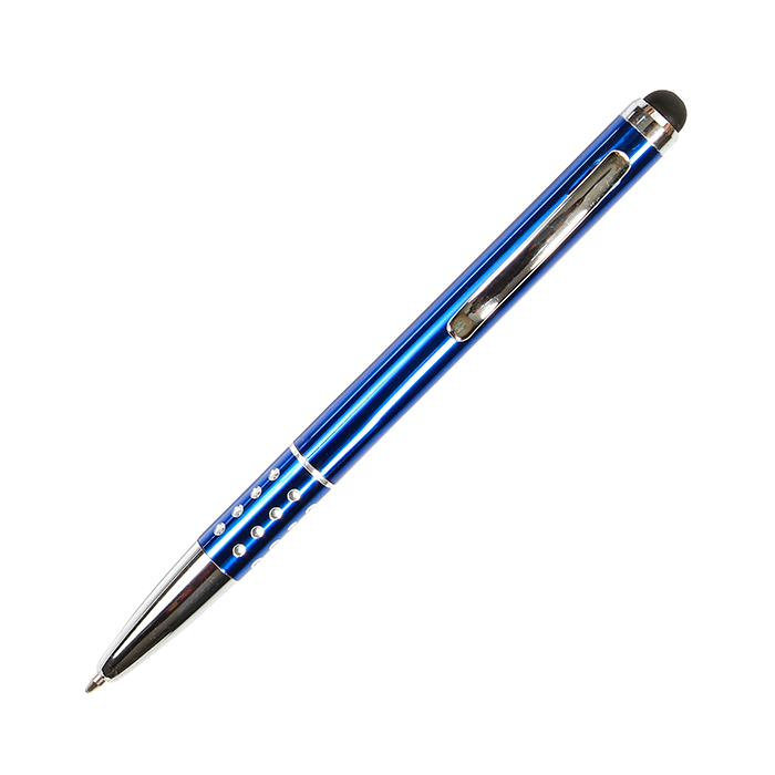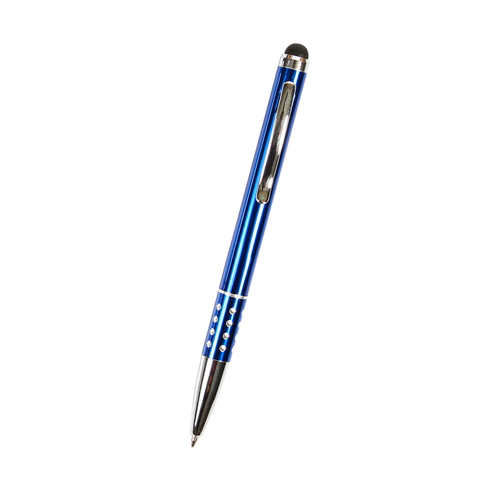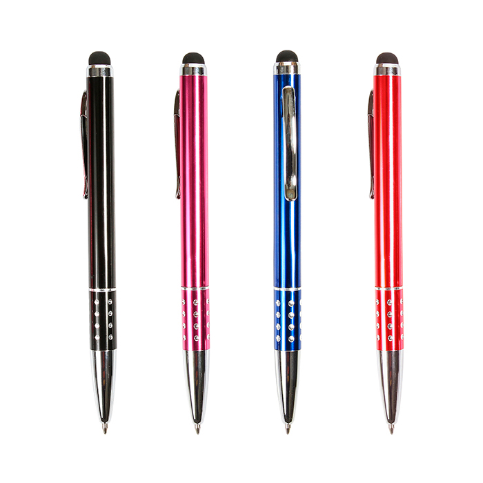 Bolígrafo metálico con puntero touch, clip y punta con acabado metálico, detalle tipo piedra brillante en grip y estuche triangular de plástico transparente. Tinta de escritura negra.
