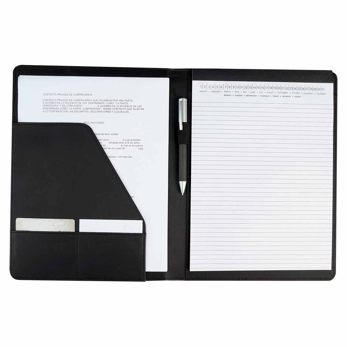 Incluye block de raya tamaño A4 con 20 hojas, elástico para bolígrafo, compartimento para documentos y tarjetas. No incluye bolígrafo.