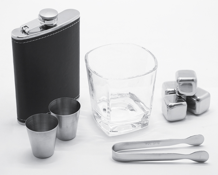 Set de licorera que incluye: Licorera de bolsillo de acero inoxidable con tapa de rosca y detalle en curpiel con CAP. 8 OZ, un vaso de vidrio para whisky, pinzas de acero inoxidable para hielos, estuche con 4 hielos metálicos y 2 vasos de acero inoxidable para shots. Incluye caja de regalo.
