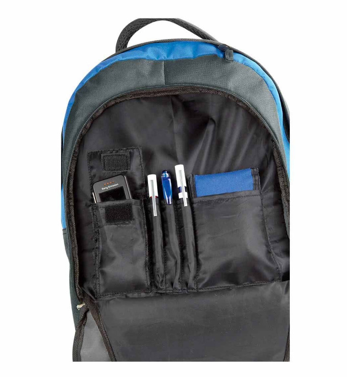 Bolsa frontal con compartimento para 3 bolígrafos, celular y documentos. Espacio para laptop.