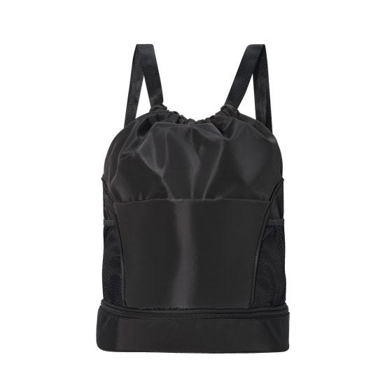 Bolsillo frontal con cierre y dos mallas laterales. En la base compartimento con cierre para zapatos o accesorios. asas ajustables con broche metálico.