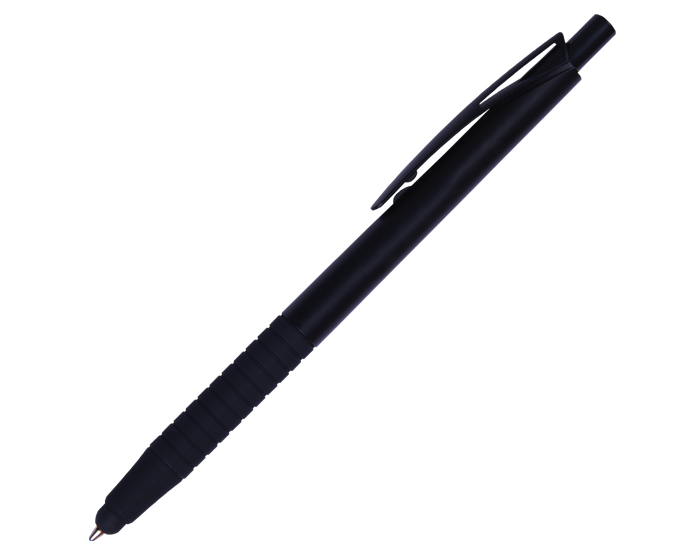 Bolígrafo de plástico en colores metálicos, punta touch y goma antideslizante. Mecanismo de click.