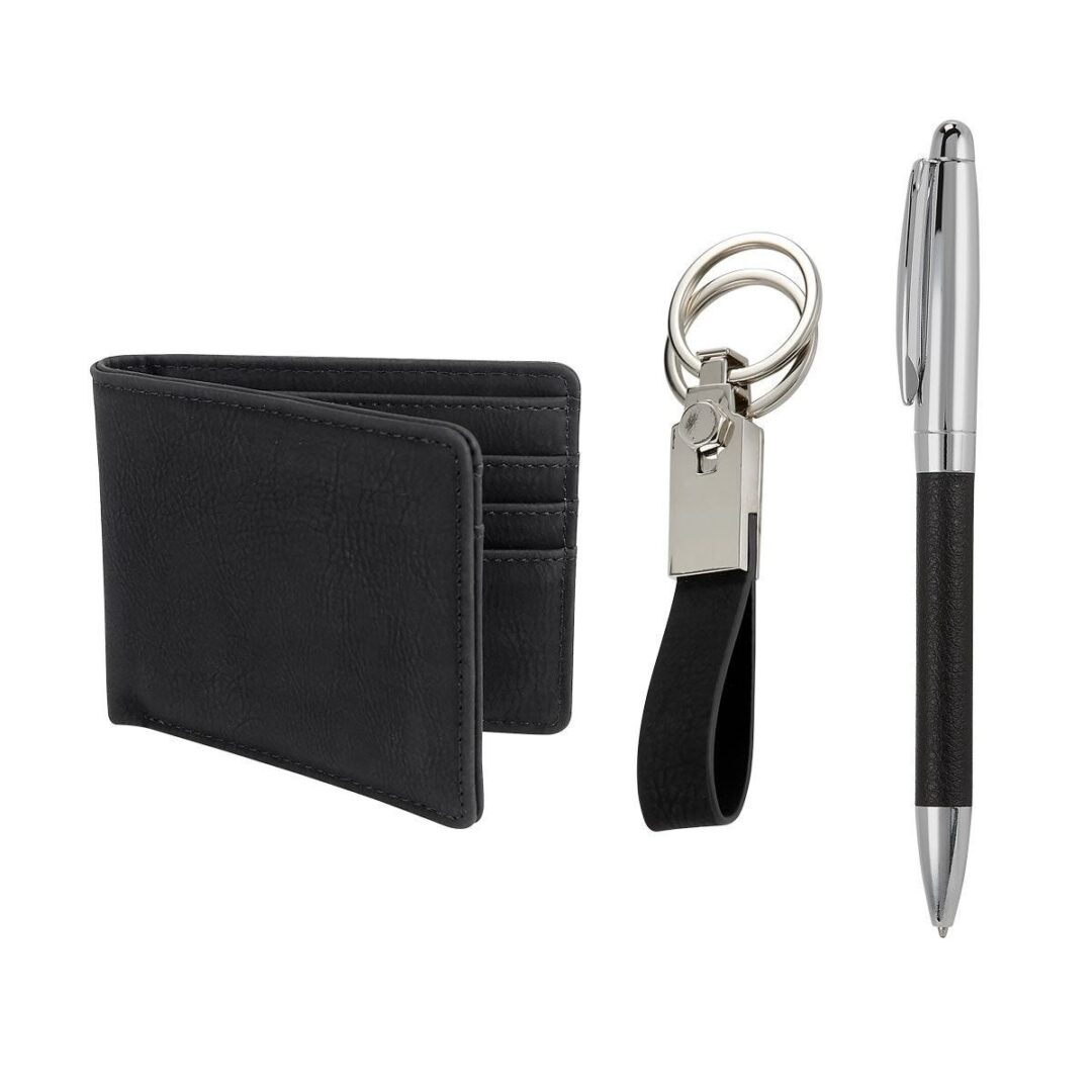 Incluye bolígrafo, llavero, cartera con organizador de tarjetas, credenciales, compartimento doble para billetes y caja de regalo.
