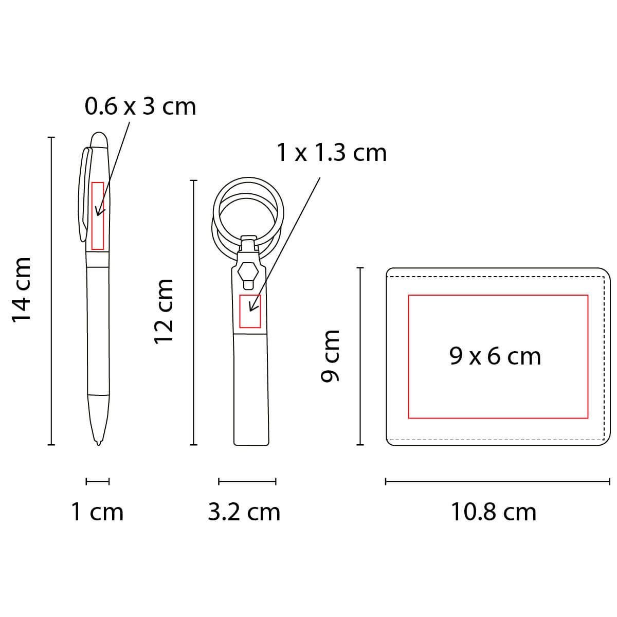 Medida3.2 x 12 cm Llavero / 1 x 14 cm Bolígrafo / 10.8 x 9 cm Cartera