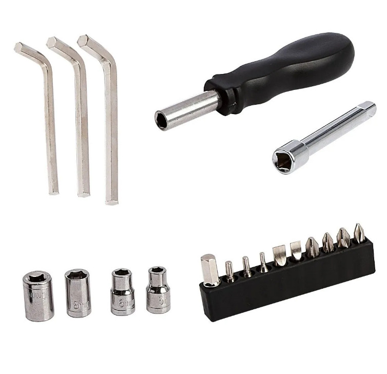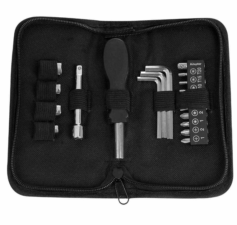 Contiene desarmador, 10 puntas de desarmador, llaves hexagonales, dado extensión y 4 dados. Incluye estuche de tela.