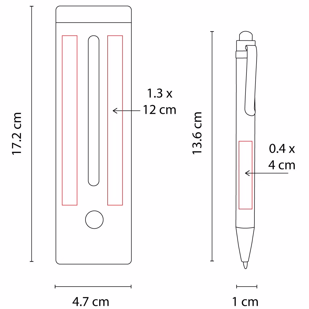 | Área | 0.4 x 4 cm Bolígrafo / 1.3 x 12 cm Estuche |