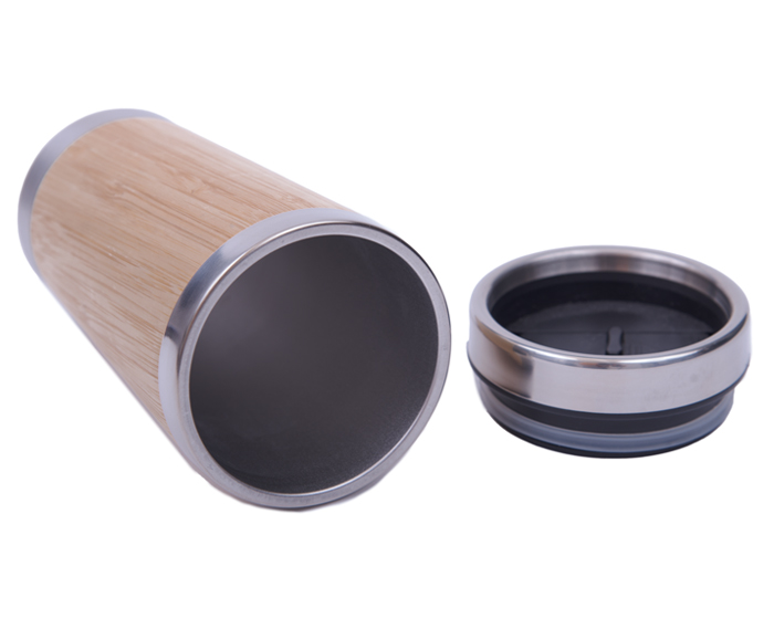 Termo cubierta de bamboo sin duda muy bonito por su apariencia se puede grabar en laser y tu logo resaltara aun mas