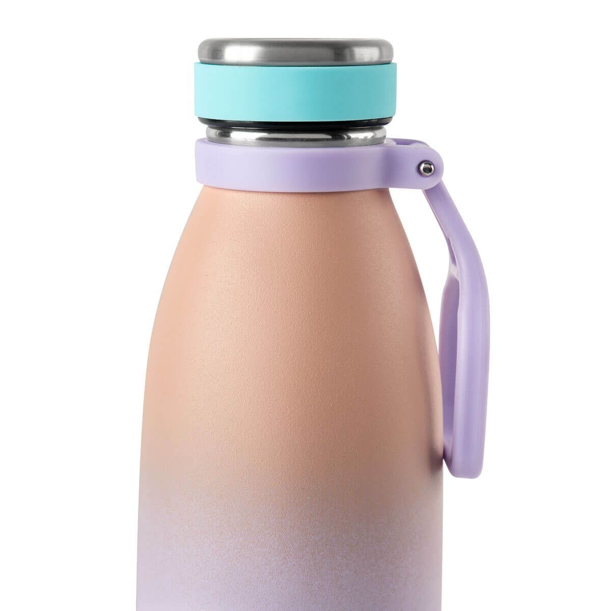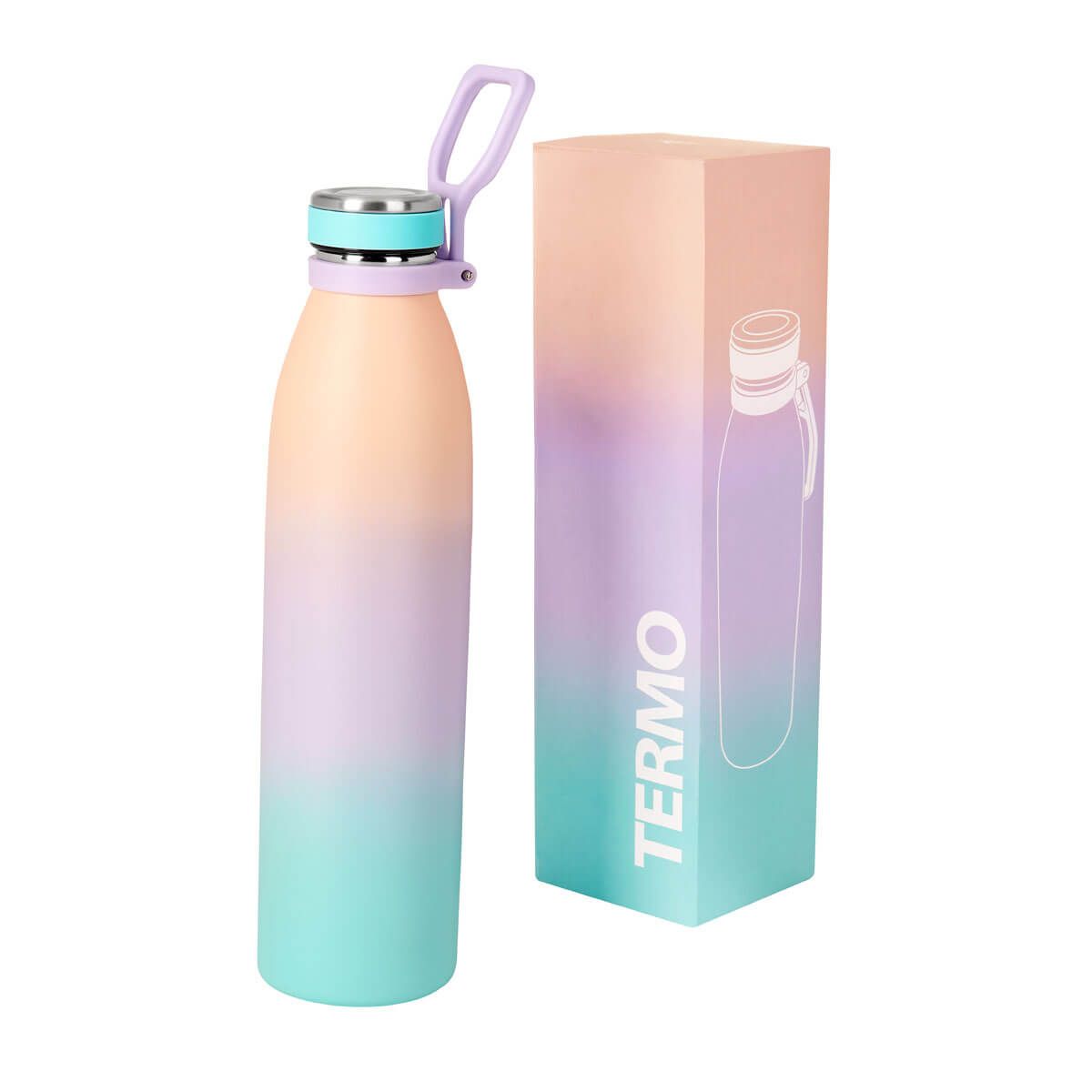 Doble pared. Cerrado al vacío. Pared interna y externa acero inoxidable. Terminado rugoso color degradado. Tapa de rosca. Cuenta con asa. Mantiene temperatura caliente 8 hrs y temperatura fría 12 hrs aproximadamente. Incluye caja individual.